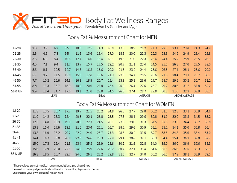 This document will show you what Body Fat % category you fit into once you have had a Fit3D Body Scan. This document is intended to help you set body compostion goals and give you a rough idea of how healthy your body compostion is. It should be used as a guideline only. It is not intended to be used to make medical decisions.